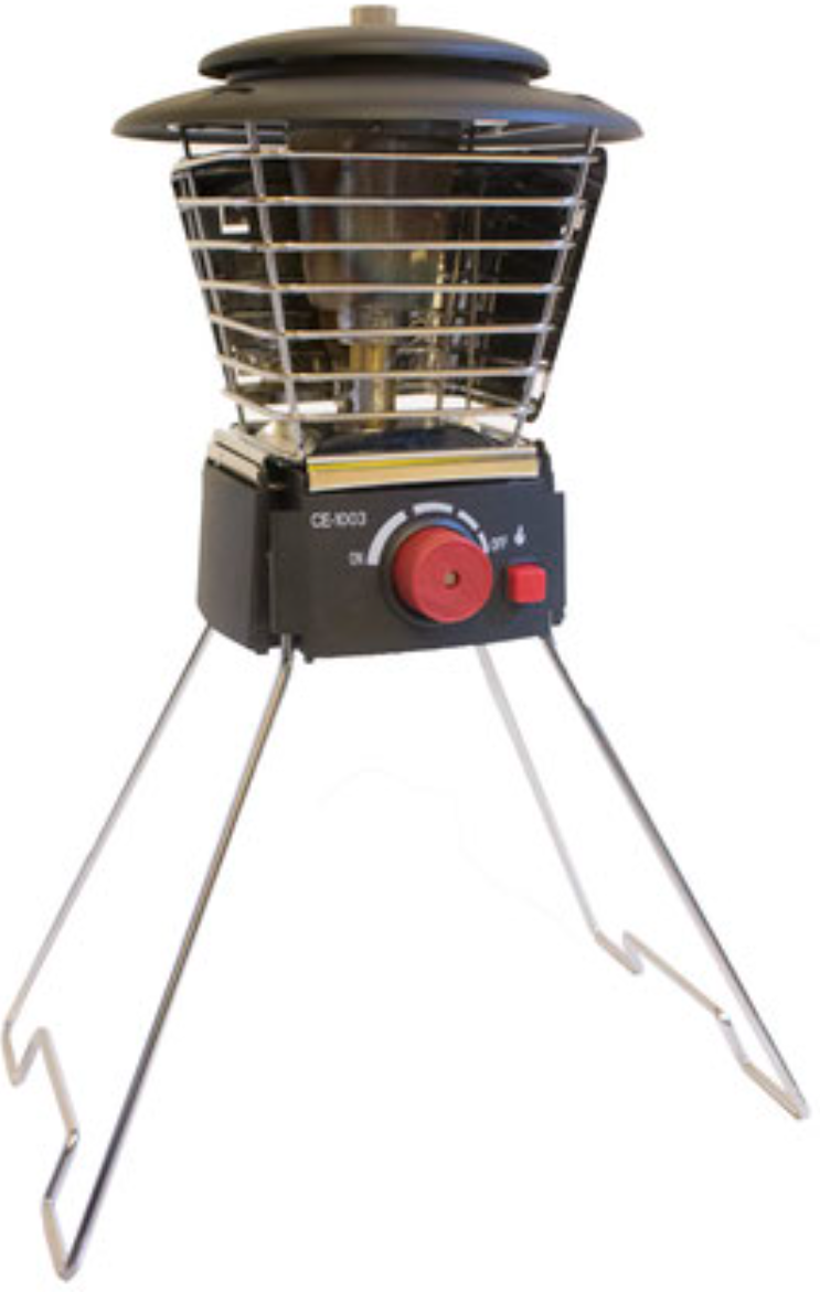 Calentador portátil de gas butano para uso con cartucho de butano de rosca de 240g, con encendido piezo eléctrico y bolsa transportadora.